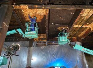 「煤の清掃がおろそかだと、火災消臭は成り立たない」とのことで、まずは煤清掃・ケレン作業。具体的には、養生作業と掃き掃除、拭き掃除、ケレン作業が進められていきました。